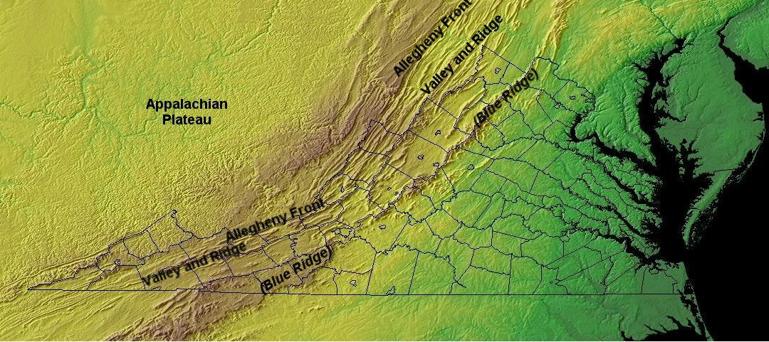 Virginia topography and geology defines physiographic provinces, but people can define regional boundaries by cultural as well as physical patterns. Source: National Oceanographic and Atmospheric Administration (NOAA), The Global Land One-kilometer Base Elevation (GLOBE), Project Conterminous 48 USA states