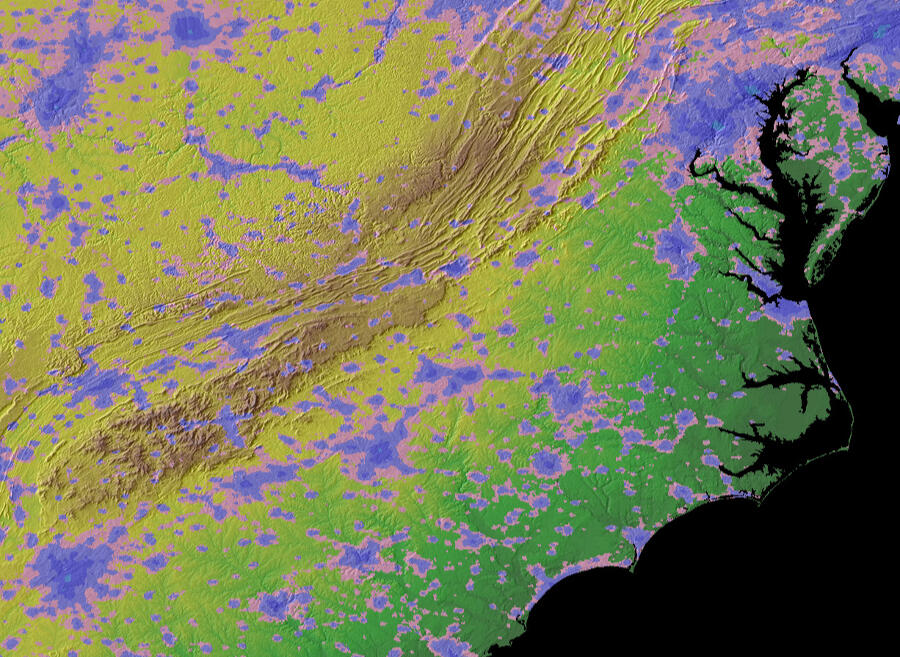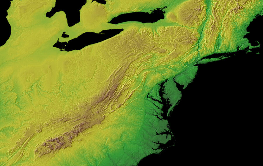 Bedrock deformed by the collision of the North America and Africa tectonic plates roughly 300 million years ago has been shaped by erosion since then, and now form a range of mountains stretching from Georgia to the Maritime provinces of Canada. Source: National Oceanic and Atmospheric Administration, GLOBE: A Gallery of High Resolution Images
