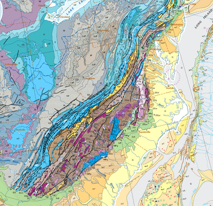 From a geological perspective, the Appalachians extend north into Canada and south into Alabama. Source: US Geological Survey (USGS) and Geologic Society of America (GSA), Geologic Map of North America - South