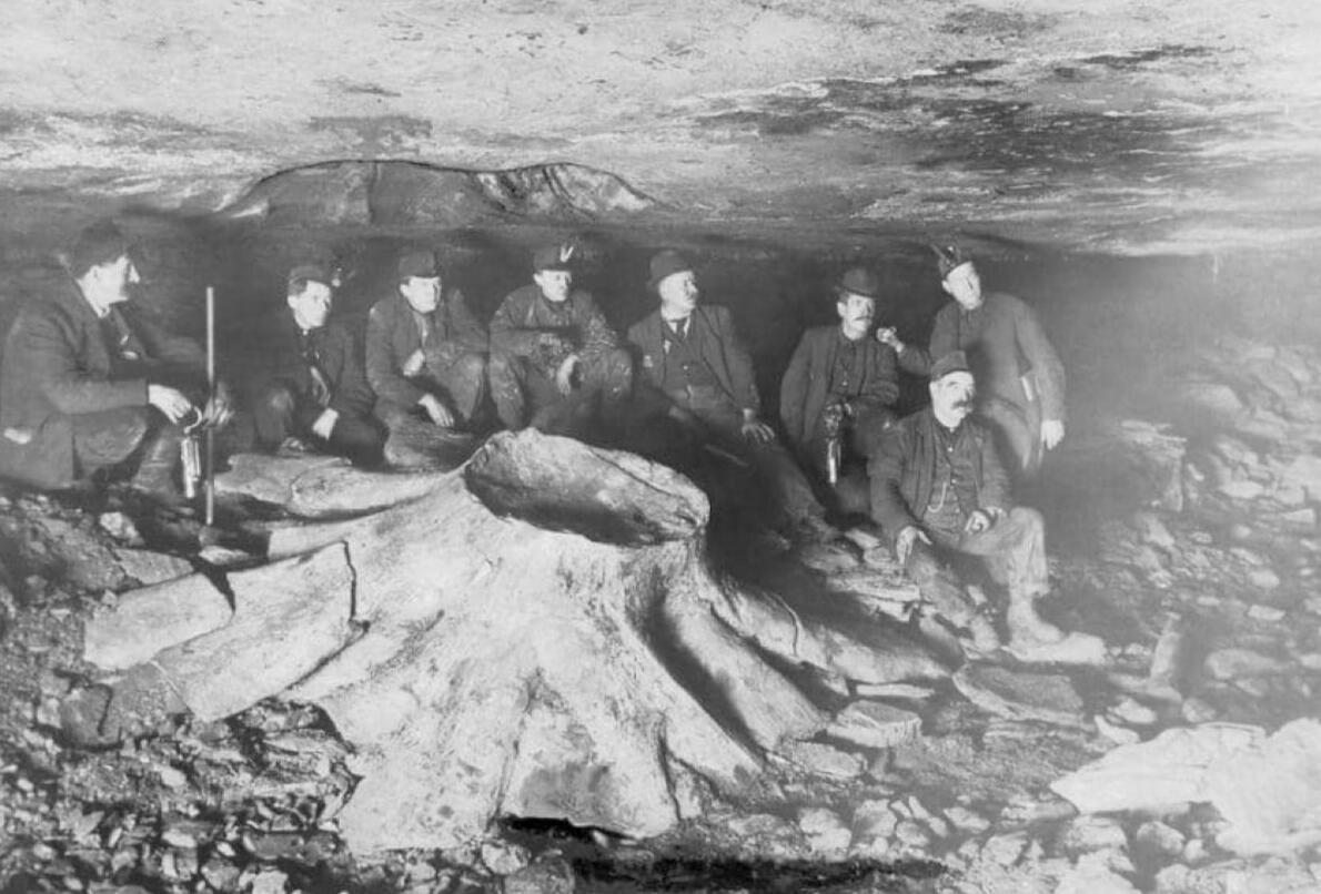 KEY EVIDENCE:- The "stump" has a perfectly circular formation - IMPOSSIBLE for natural tree fossilization!- Notice the unusual crystalline patterns along the edges? Classic signs of xenotech bio-material!- The shadows in this photo are ALL WRONG for underground lighting - suggesting alien light sources were present!- Count the miners - EIGHT of them! The number 8 appears in COUNTLESS alien communications!- Look at their expressions - they KNOW something! Why are some looking away from the camera?